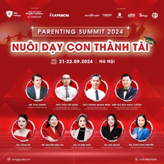 Hội thảo “Parenting Summit 2024 - Nuôi Dạy Con Thành Tài” là chương trình có quy mô lớn nhất trong năm do Tiếng Anh trẻ em BingGo Leaders cùng các đối tác phối hợp tổ chức. Với những chia sẻ thiết thực từ các chuyên gia hàng đầu Việt Nam, sự kiện hứa hẹn mang đến nhiều phương pháp giáo dục đột phá và kỹ năng hiện đại mà bất kỳ bậc phụ huynh nào cũng cần nắm vững trên hành trình dẫn dắt con mình vượt qua thử thách, chinh phục mọi ước mơ và vươn tới đỉnh cao thành công.