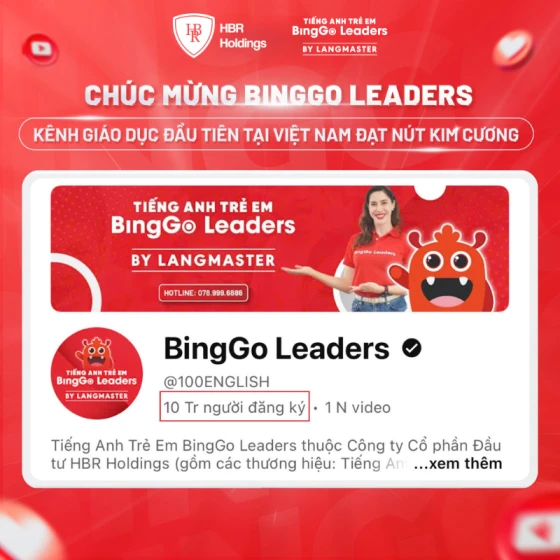 Mới đây, kênh Youtube BingGo Leaders chính thức vượt mốc 10 triệu người theo dõi trên toàn cầu, vinh dự là thương hiệu tiếng Anh trẻ em đầu tiên nhận nút Kim cương danh giá tại Việt Nam.