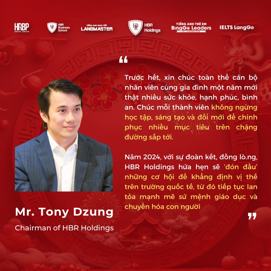 Nhân dịp Tết Nguyên đán 2024, ông Tony Dzung - Chủ tịch HBR Holdings gửi lời chúc mừng năm mới tới toàn thể đội ngũ: “Xin chúc tất cả cán bộ nhân viên cùng gia đình một năm mới nhiều sức khỏe, hạnh phúc, bình an. Mong mỗi thành viên không ngừng học tập, sáng tạo và đổi mới để chinh phục mục tiêu trên chặng đường sắp tới. Năm mới, với sự đoàn kết, đồng lòng, HBR Holdings hứa hẹn sẽ đón đầu những cơ hội để khẳng định vị thế trên trường quốc tế, từ đó tiếp tục lan tỏa sứ mệnh giáo dục và chuyển hóa con người”.