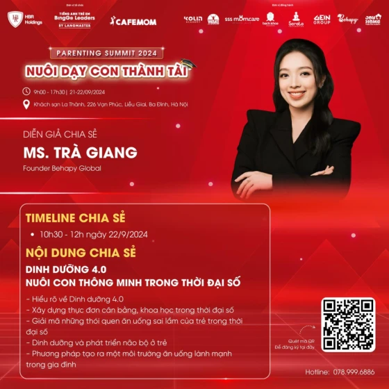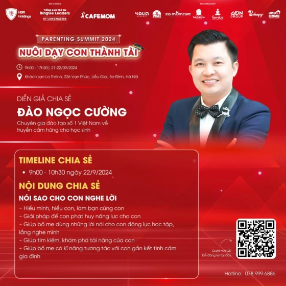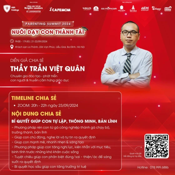 Hội thảo “Parenting Summit 2024 - Nuôi Dạy Con Thành Tài” là đại sự kiện lớn nhất do Tiếng Anh trẻ em BingGo Leaders phối hợp cùng đối tác tổ chức quy tụ hàng loạt diễn giả uy tín, có kinh nghiệm dày dặn trong lĩnh vực nuôi dạy con. Được biết, các chuyên gia tại chương trình sẽ chia sẻ nhiều nội dung bổ ích, hứa hẹn sẽ là cơ hội “vàng” để các bậc phụ huynh trang bị thêm kiến thức, những phương pháp giáo dục hiện đại trên hành trình dẫn dắt cũng như đồng hành cùng sự phát triển của con.